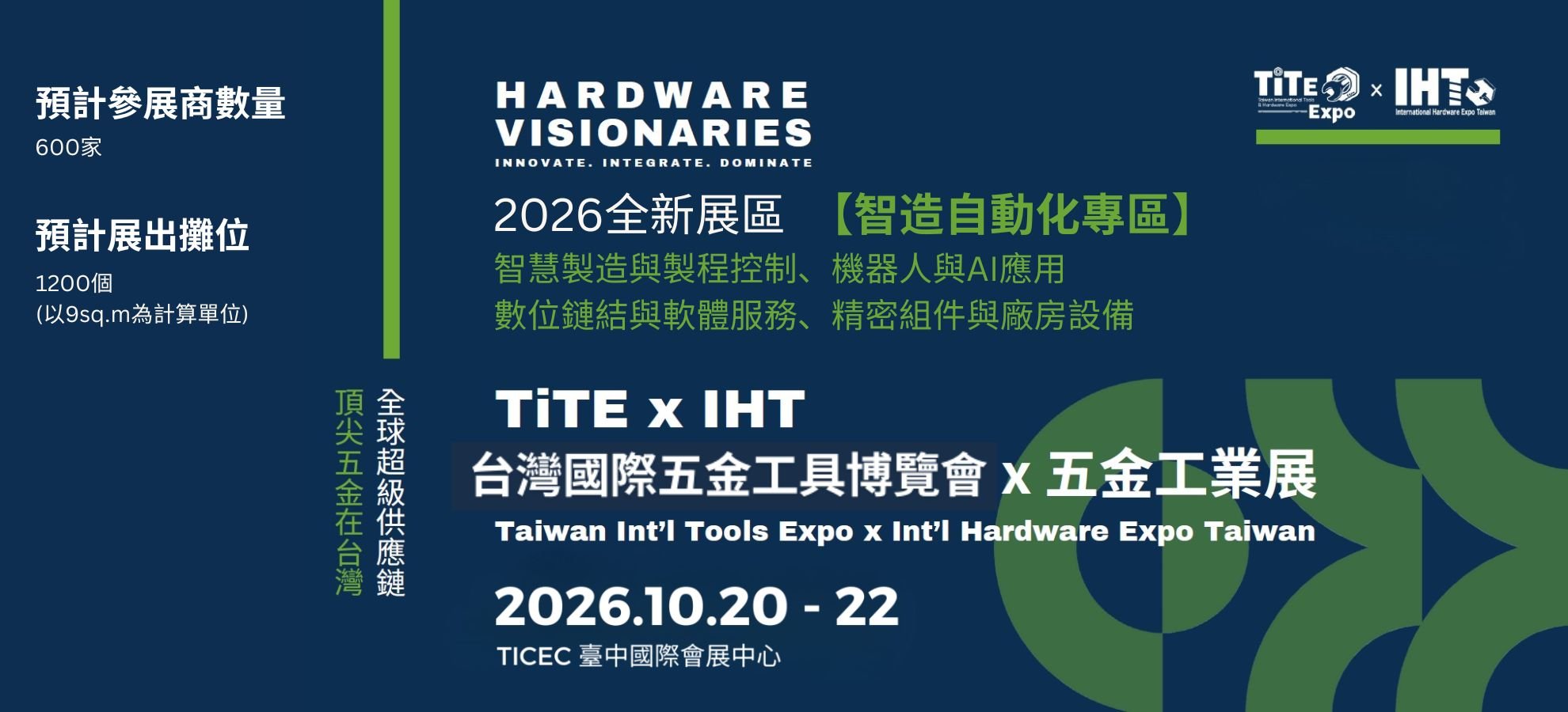 全台規模最大,中部五金工業產業盛事,由台灣手工具工業同業公會與朗盛行銷有限公司共同主辦,「 台灣國際五金工具博覽會 x 五金工業展 (TiTE x IHT),將於2026年10月20-22日在台中 (水湳) 國際會展中心」舉行,瞄準後通膨時代新商機,搶攻千億全球商機。